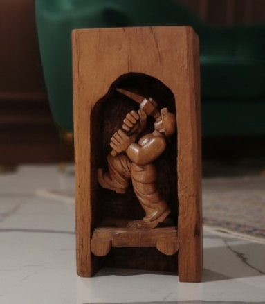 Ursi inmortaliza en esta talla el instante más intenso del trabajo minero: el golpe certero del pico que rompe la roca. La figura, encajada en su marco de madera, refleja el aislamiento del minero dentro de la galería, donde solo el sonido del metal contra la piedra acompaña su respiración.