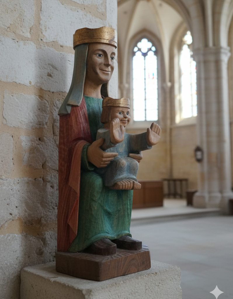 Ursi encuentra en esta Virgen románica un puente entre la fe y el arte intemporal. Tallada con la pureza de las líneas medievales, la figura irradia serenidad y recogimiento. Madre e Hijo se presentan con una frontalidad solemne, sin artificios, pero cargada de presencia espiritual.